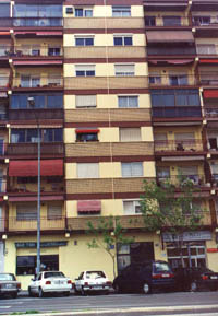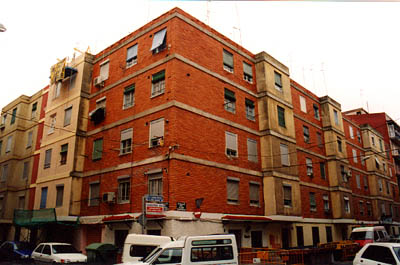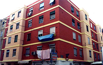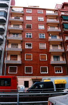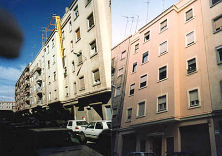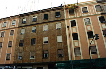 Aplicación de piedra proyectada a balcones. Resto: barniz de ladrillos Ripolin y Montokril en color salmón.